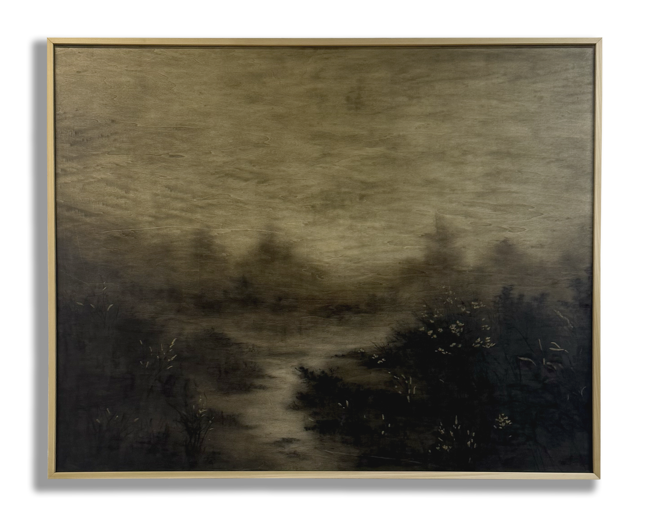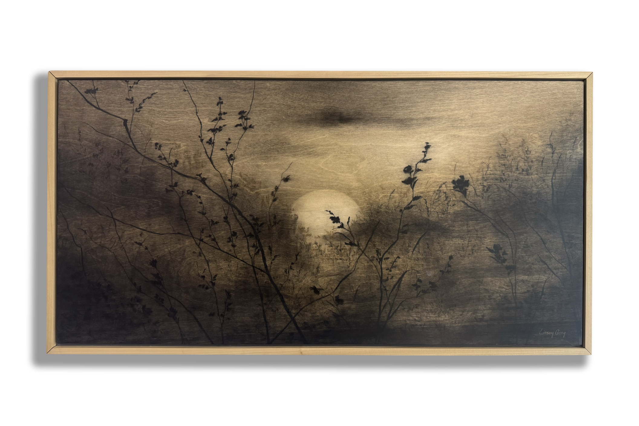 Original charcoal and pastel sketches on cotton paper with handtorn edges, float-mounted against natural birch and framed behind glass. Released in small batches only a few times a year.