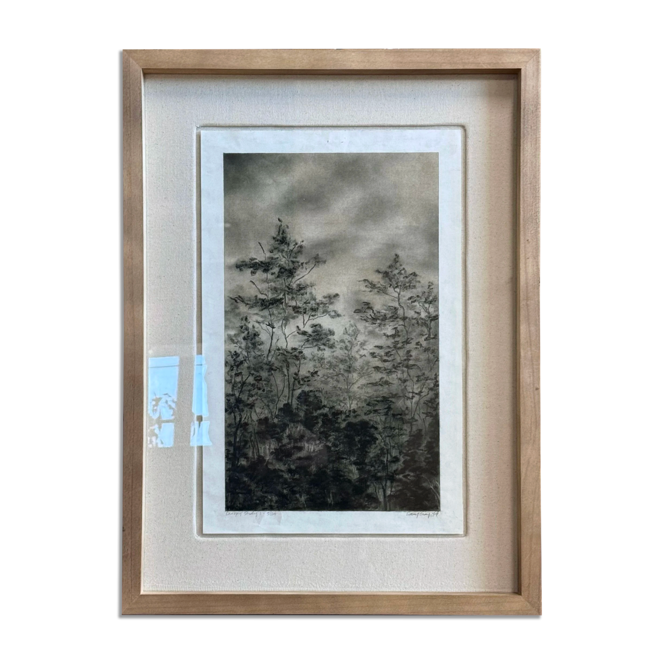This work has been finished with an archival fixative, however the medium is still vulnerable to smudging and therefore should not be removed from its frame. Display in a cool, dry environment out of direct sunlight and away from any strong heat source like a fireplace to prevent the artwork from fading or warping. Gently clean with a soft, lint-free cloth to remove dust or smudges. Avoid scratching the frame or glass with sharp objects.